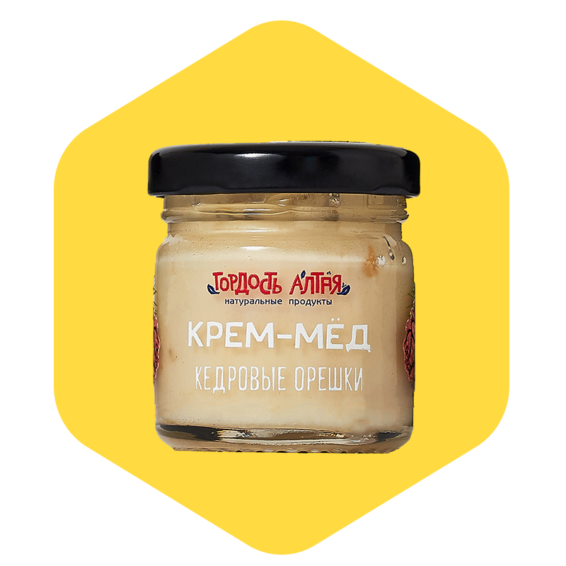 Крем-мёд с кедровыми орешками — это натуральный десерт на основе цветочного алтайского мёда, взбитого до мягкой кремовой текстуры, с добавлением цельных отборных кедровых орехов. Орехи равномерно распределены по всей массе и придают продукту хрустящую структуру и насыщенный вкус.